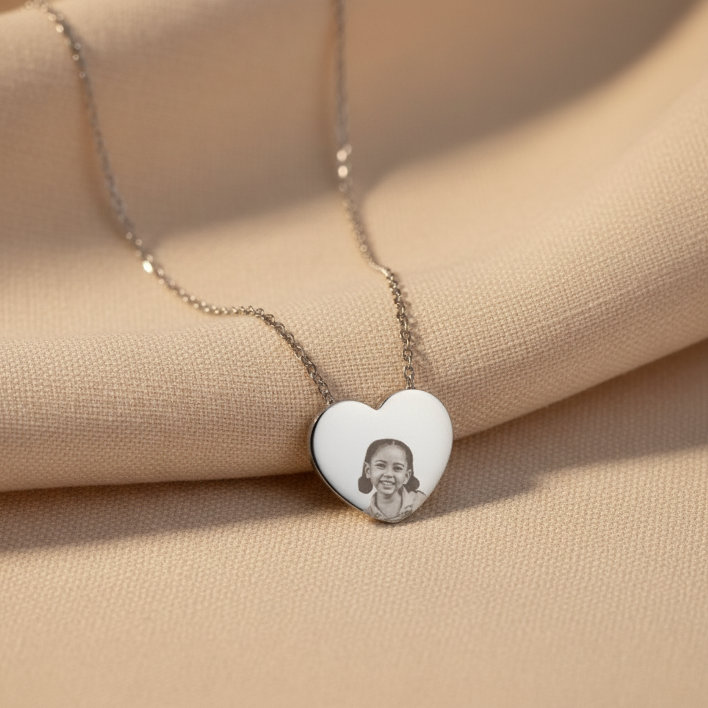 Banhada em tom prateado, a peça destaca-se pela nitidez da personalização central, onde a fotografia escolhida é integrada ao metal com alta definição. Seus traços fluidos e o contorno delicado do coração criam uma estética harmoniosa, tornando-a uma joia atemporal e cheia de significado.