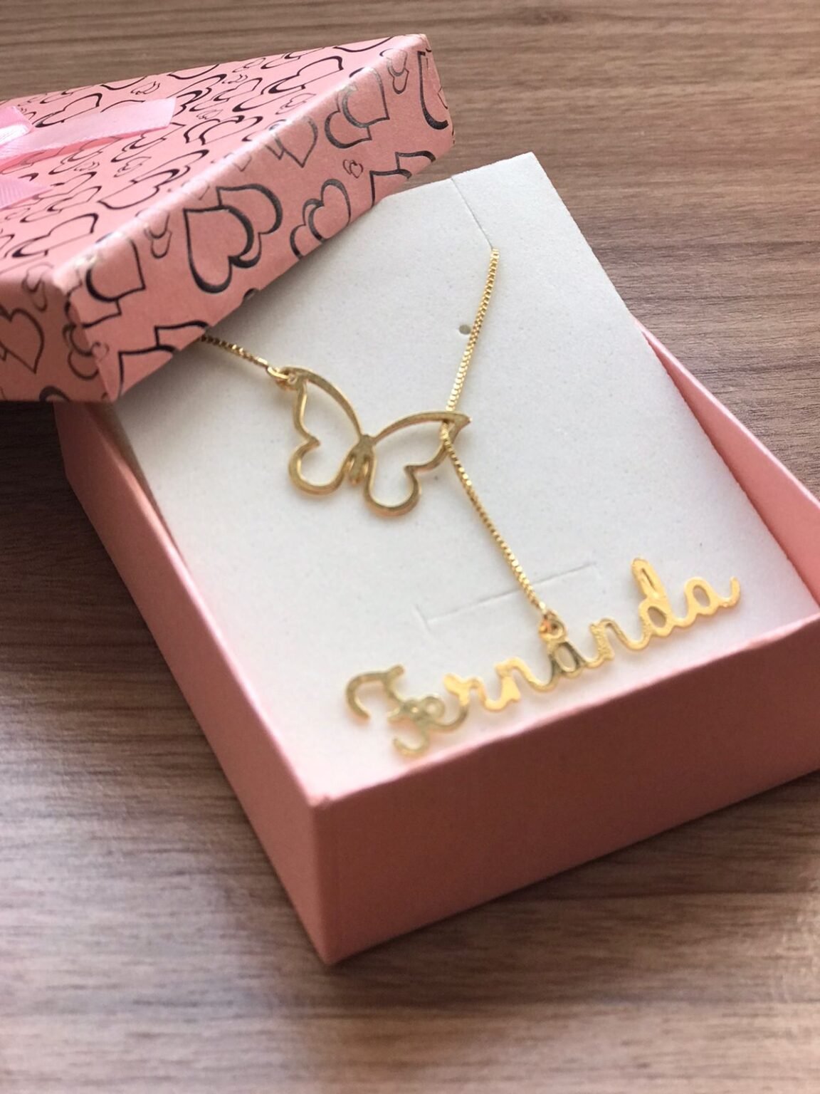 Colar Gravata, com Nome e Borboleta Vazada, Personalizado e banhado a Ouro