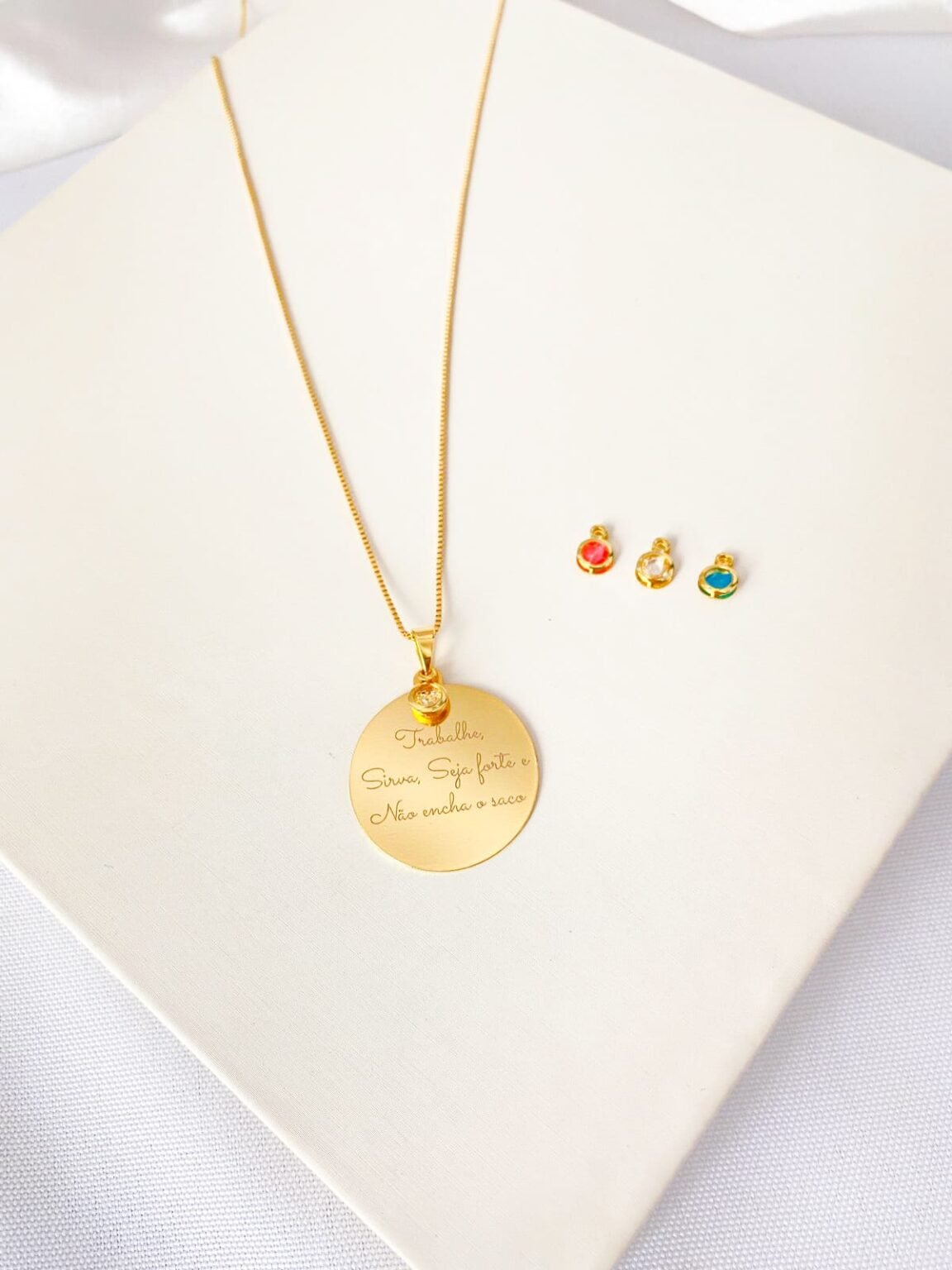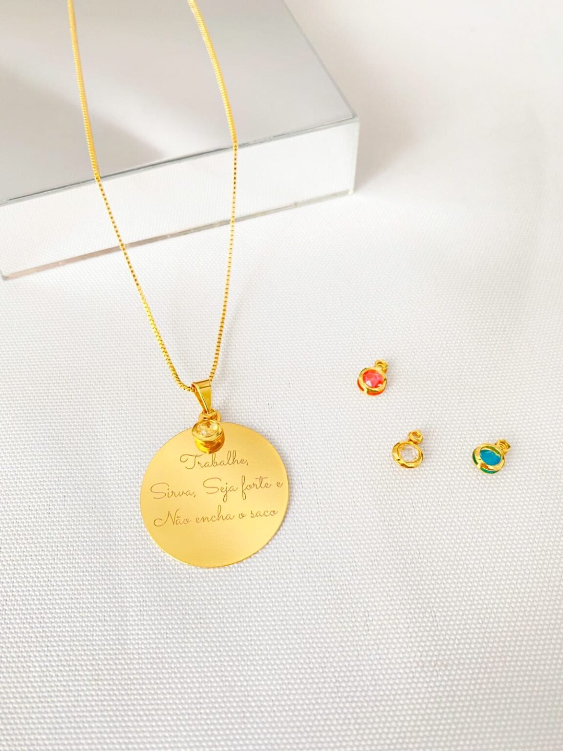 Colar Redondo Personalizado, Frase com Pingente Strass, Banhado a Ouro