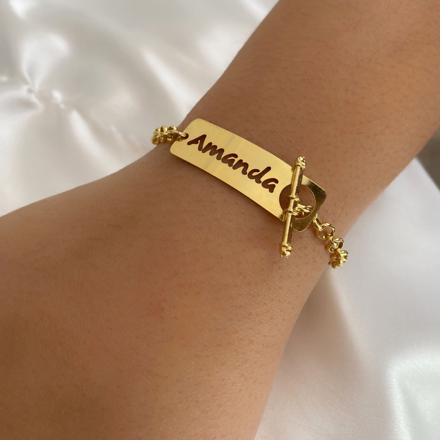 Pulseira Placa Lisa, Personalizado com nome, banhado ouro 18K.