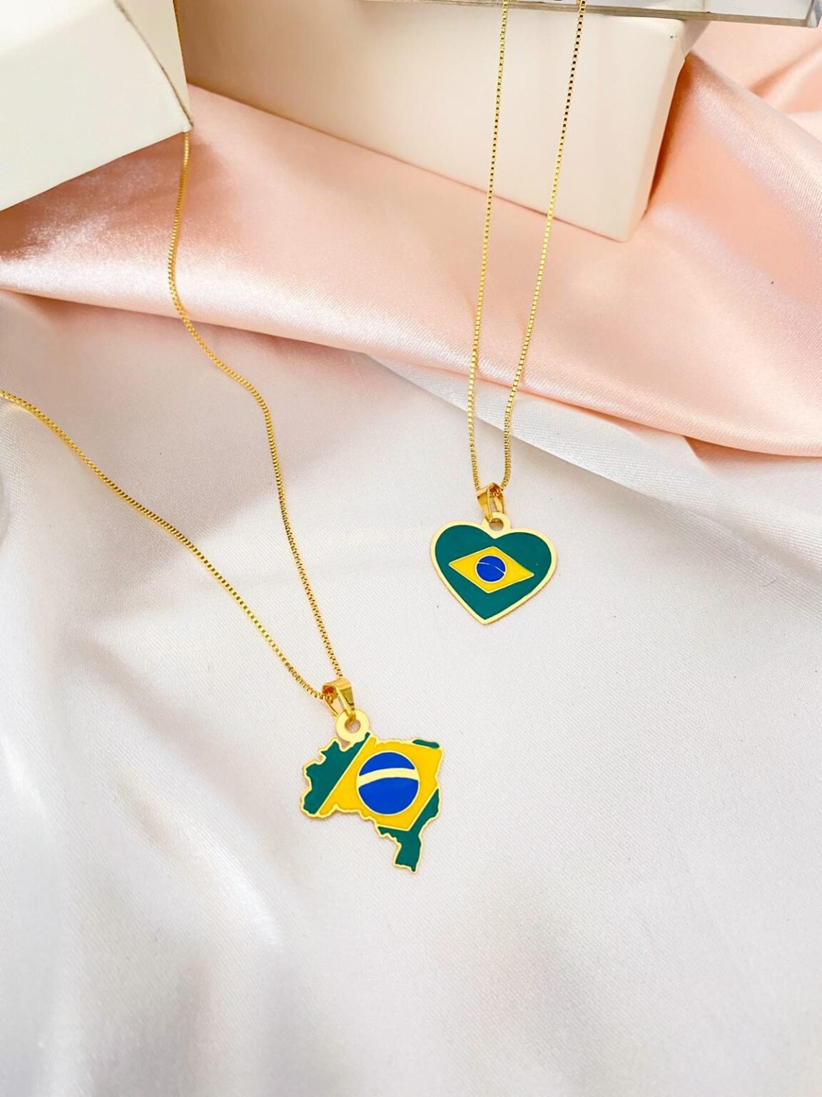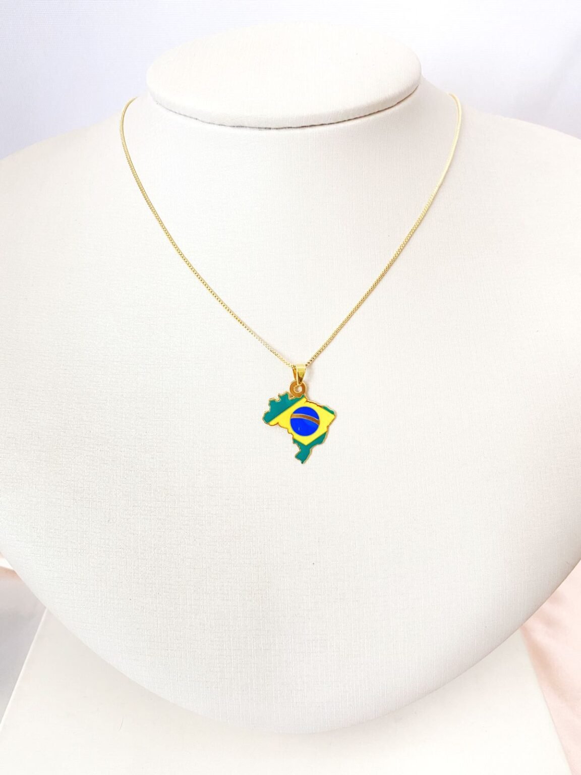 Colar Bandeira do Brasil Dourado Simples, Sem resina Banhado a Ouro 18K