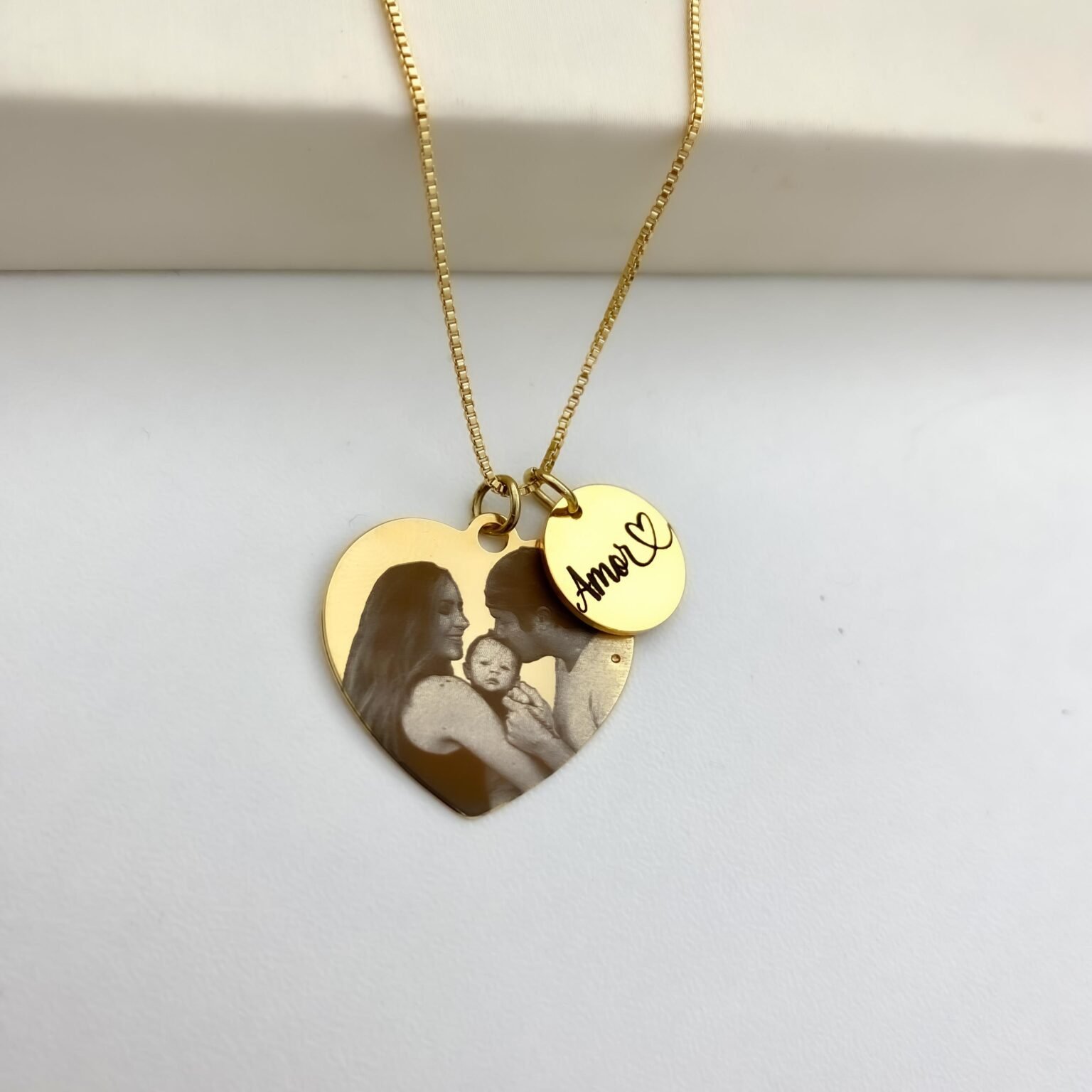 Colar Coração e Redondo Duplo, Personalizado com Nome e Foto, Banhado a ouro