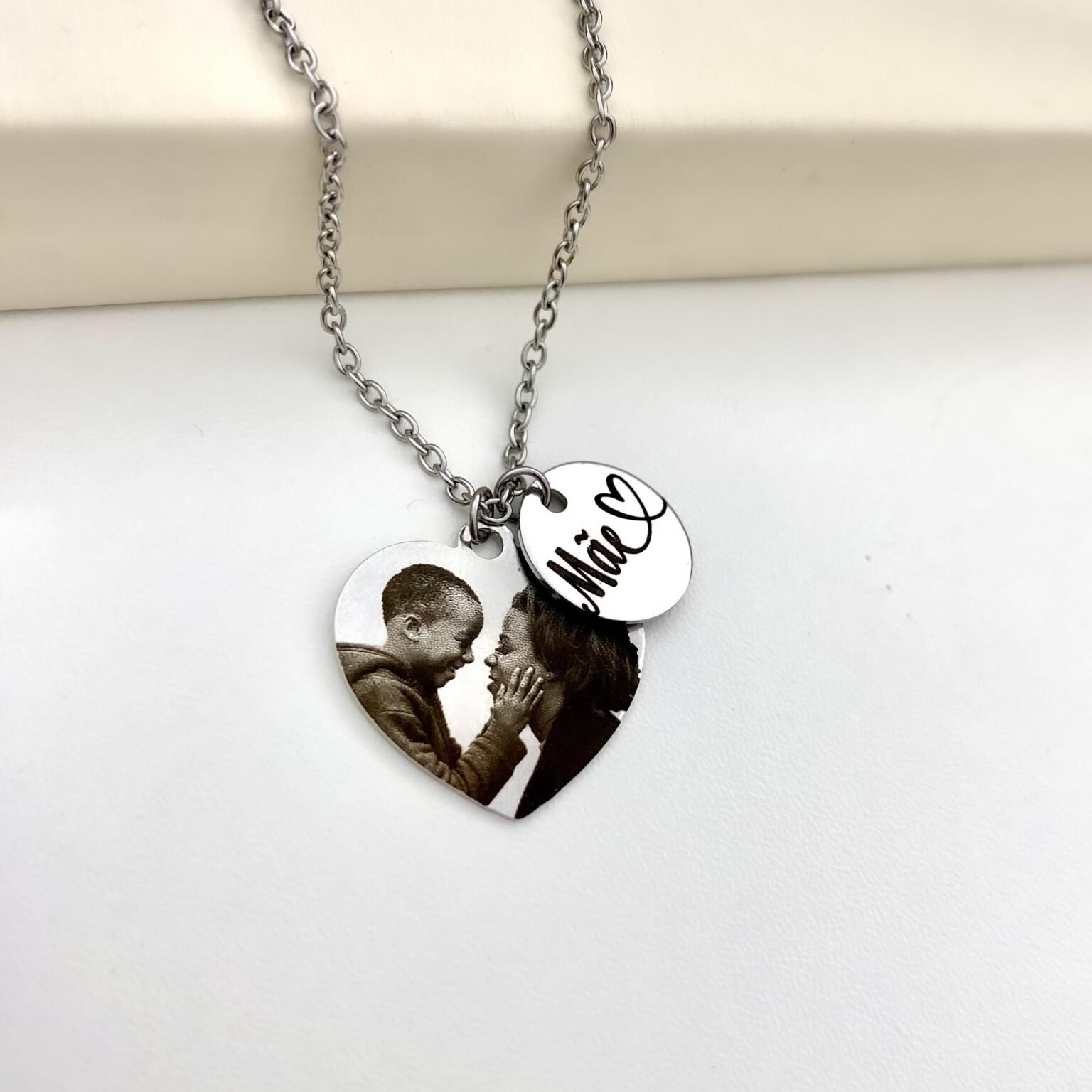 Personalizado com dois pingentes Coração e Redondo gravados com um nome e uma foto.