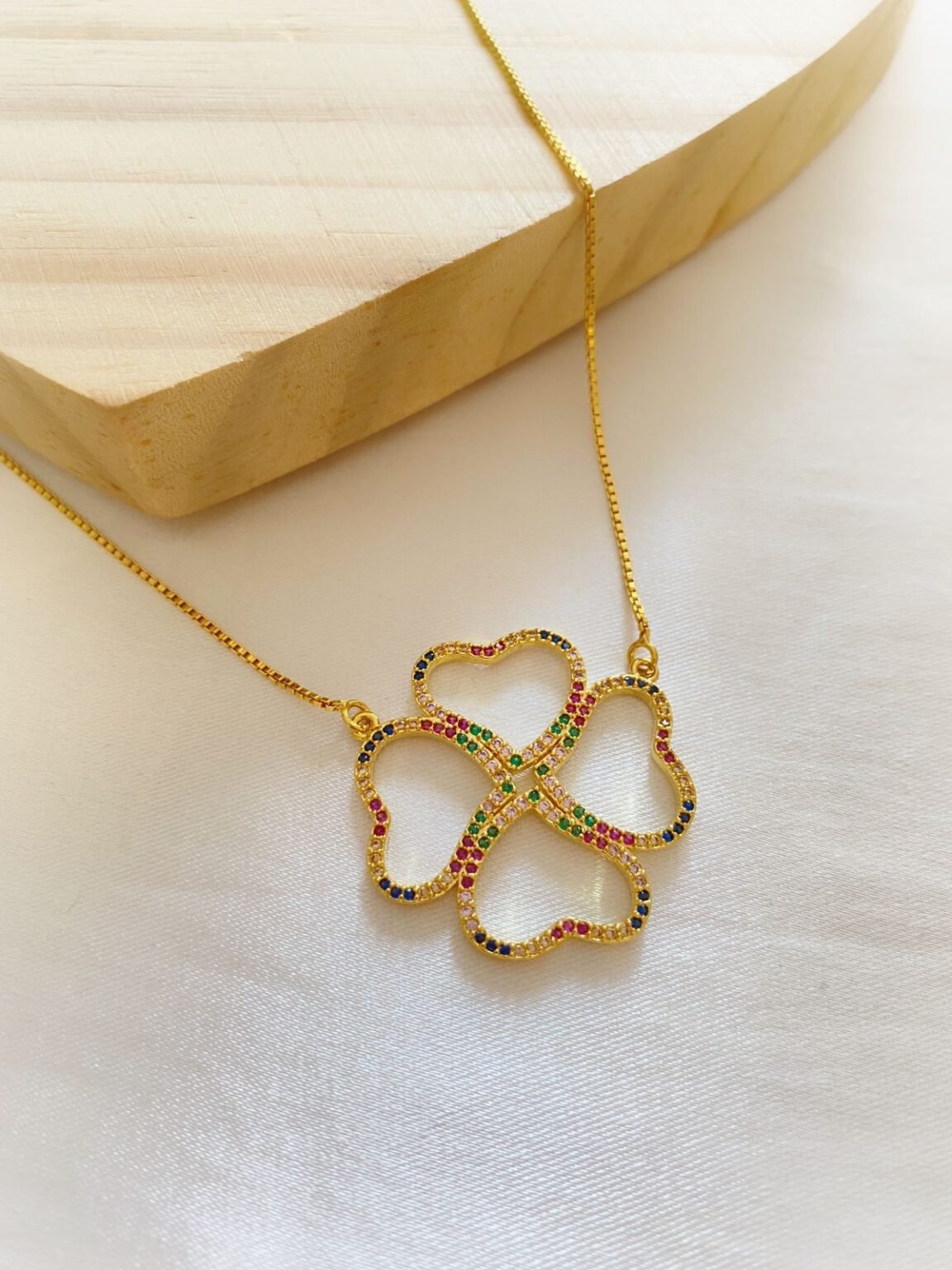Colar Quatro folhas de Coração Vazado, com Pedras Coloridas