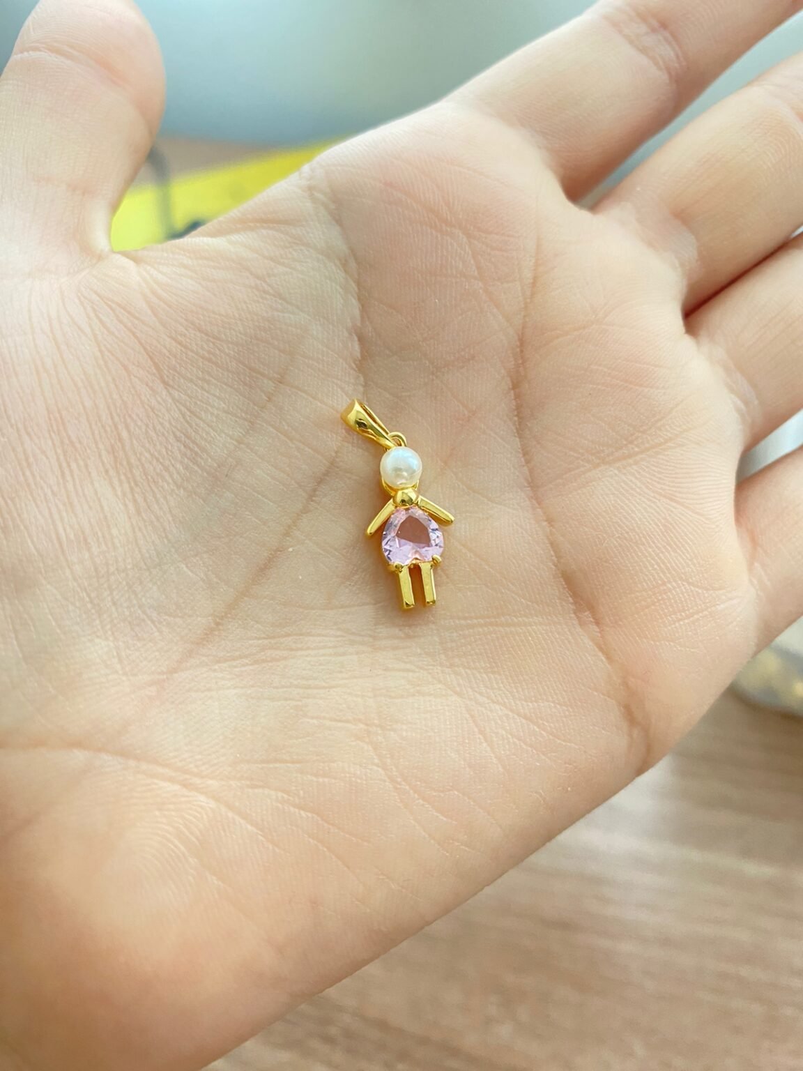 Pingente Menina, com Zircônia Rosa e Pérola, Banhado á Ouro