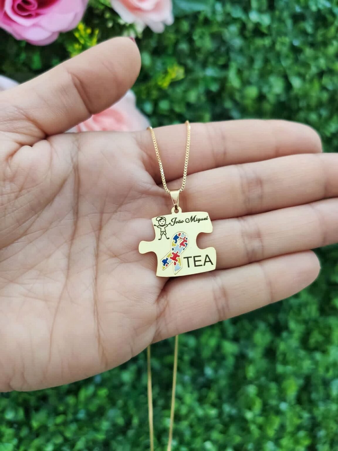 Colar Autismo, Quebra-Cabeça Personalizado com Nome, Banhado a Ouro 18K